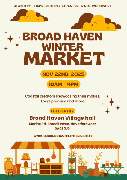 Join us at Broad Haven Village Hall for a winter market, on Saturday the 22nd of November from 10am-4pm.