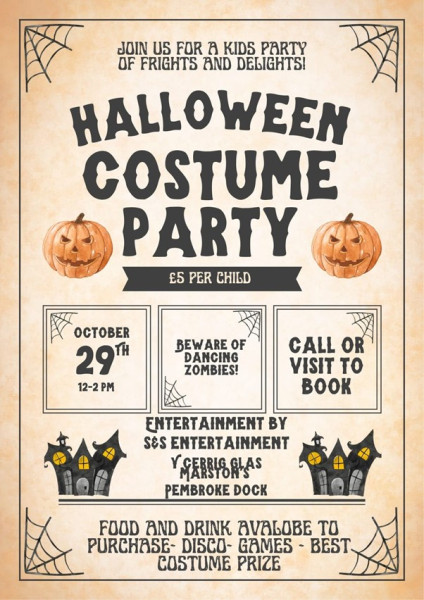 Who's ready for a some spooktacular fun � with entertainment from S&S Entertainments come and join us on the 29th of October 12-2pm food being served! £5 per child.... So come and join us and have some fun!! Prize for the best Halloween costume!! Call us on 01646 684435 or pop in and ask for details.