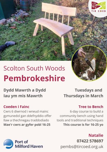 6 day course throughout March to build a community bench using hand tools and traditional techniques. Course start date is Thursday 5th March and will run on Tuesdays and Thursdays throughout March.