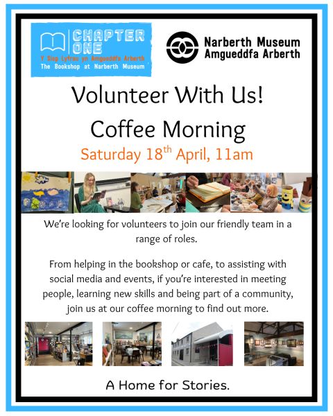 Join us on Saturday 18th April at 11am to learn more about volunteering with Narberth Museum and Chapter One Bookshop. We have varied roles available from bookseller and barista roles to social media, so join us for a friendly chat and coffee and cake and get to know us better.